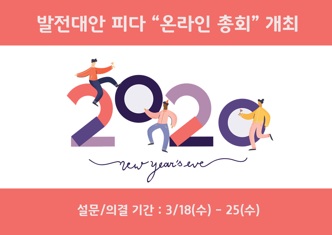 올해 피다 사무국은 조금 서둘러 2월 총회를 준비했었다. 한해 활동계획을 조금 더 일찍 회원들과 공유하고 활기찬 걸음을 시작하기 위해서였다. 그러나 2월 중순 바이러스에 대한 정부 위기 경보 단계가 ‘심각’으로 격상됨에 따라 다수가 모이는 회의, 모임, 집회 등 다양한 사회 활동들이 제한되었다. 피다의 활동터인 은평 서울혁신파크 건물도 개별 사무실 외 모든 공용공간들에 대해 무기한 사용정지 조치가 시행되었다. 총회를 위해 피다의 활동터로 회원들을 초대하고자 했던 계획을 실현하기 어렵게 되었다. “회원들의 건강과 사회적 분위기를 고려한 현실적인 대책이 필요하다” 는 사무국과 운영위원회의 의견을 모아, 올해 총회는 창립 이래 처음으로 <온라인 총회> 형태로 진행하기로 결정했다.