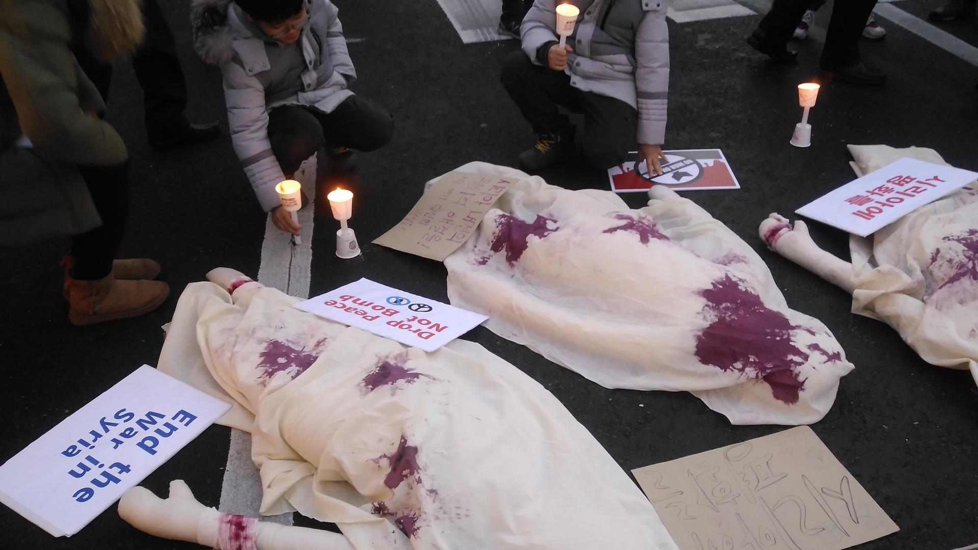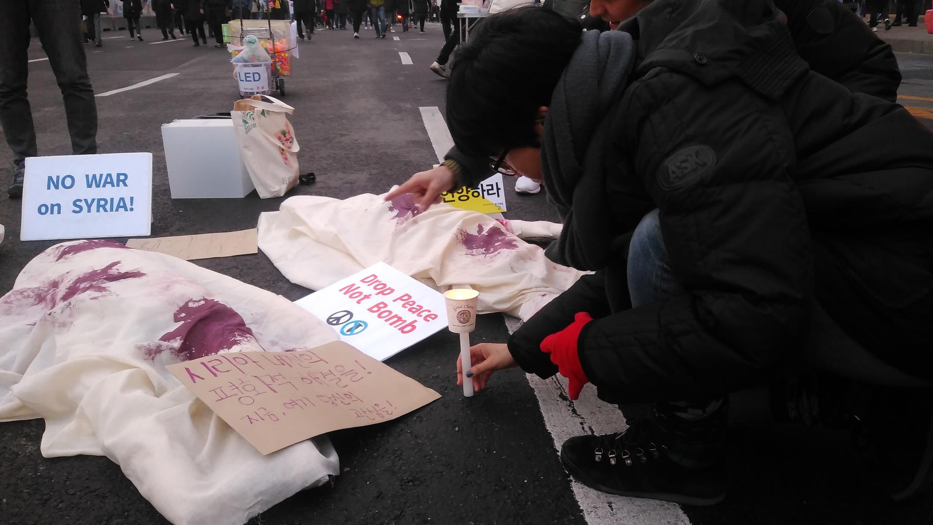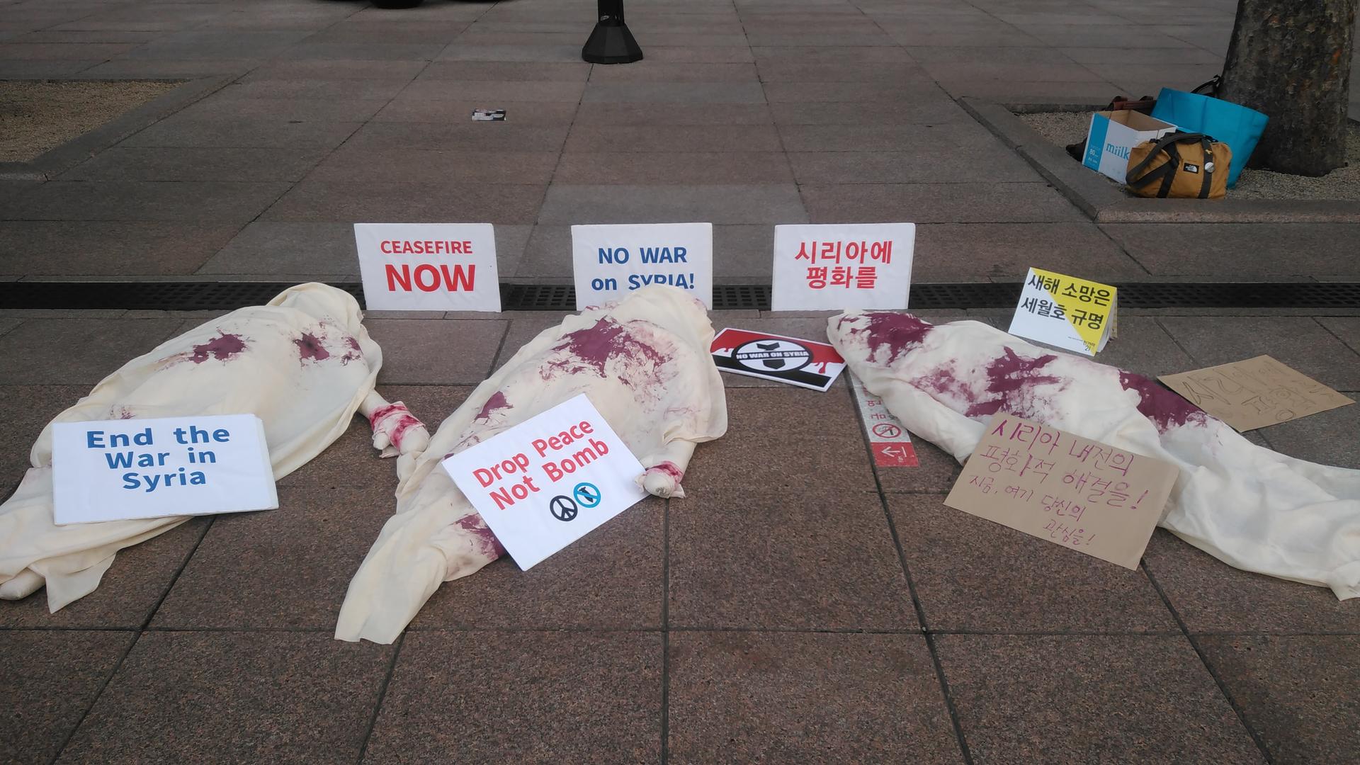 12월 16일 주한러시아대사관 앞에서 시리아인을 포함한 아랍인, 한국인이 모여 러시아의 공습을 규탄하는 자유발언을 시작으로, 12월 20일에는 20개 시민사회단체가 광화문 광장에 모여 기자회견을 열고 내전 피해자를 형상화한 퍼포먼스를 진행했다.[1] 23일에는 러시아, 미국, 이란, 터키, 사우디아라비아, 프랑스 대사관 및 인천공항, 광화문 일대에서 동시다발 1인 시위를 이어갔고, 다시 24일에는 광화문 광장에서 퍼포먼스를 열었다.