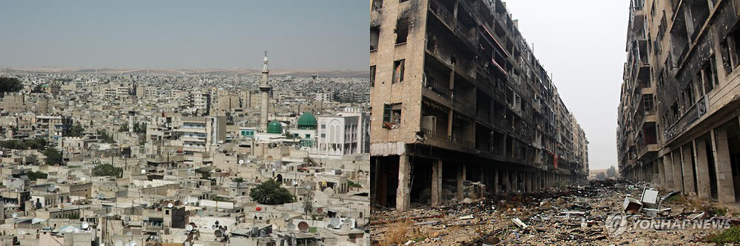 ▲전쟁 전 평화롭고 번영했던 알레포(왼쪽)과 알레포 전투 후 폐허가 된 거리(오른쪽)