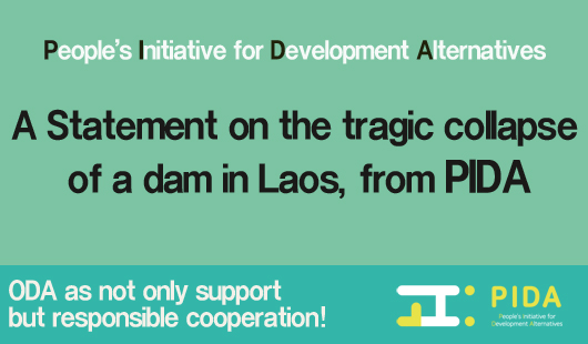 - PIDA urges the Korean government and construction companies to sincerely apologize to the people of Laos, investigate the incident thoroughly and do their best to assist rescue and recovery effort in Laos. Development should never again be imposed upon the many for the benefit of the few. The disaster in Laos is a warning that official development assistance (ODA) funded by taxpayers’ money can be turned into brutal capital that destroys the lives and homes of the people in developing countries. In order for such a tragic incident not to be repeated, we urge the Korean government to re-examine existing safeguard measures including environmental impact assessment and compliance mechanisms.