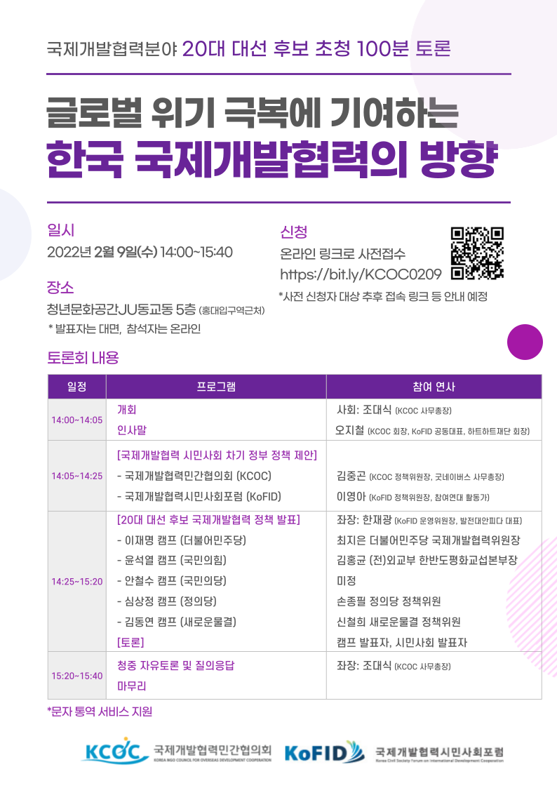 [공지] 국제개발협력분야 20대 대선 후보 초청 100분 토론회 (2/9 수 14:00 ~ 15:40)