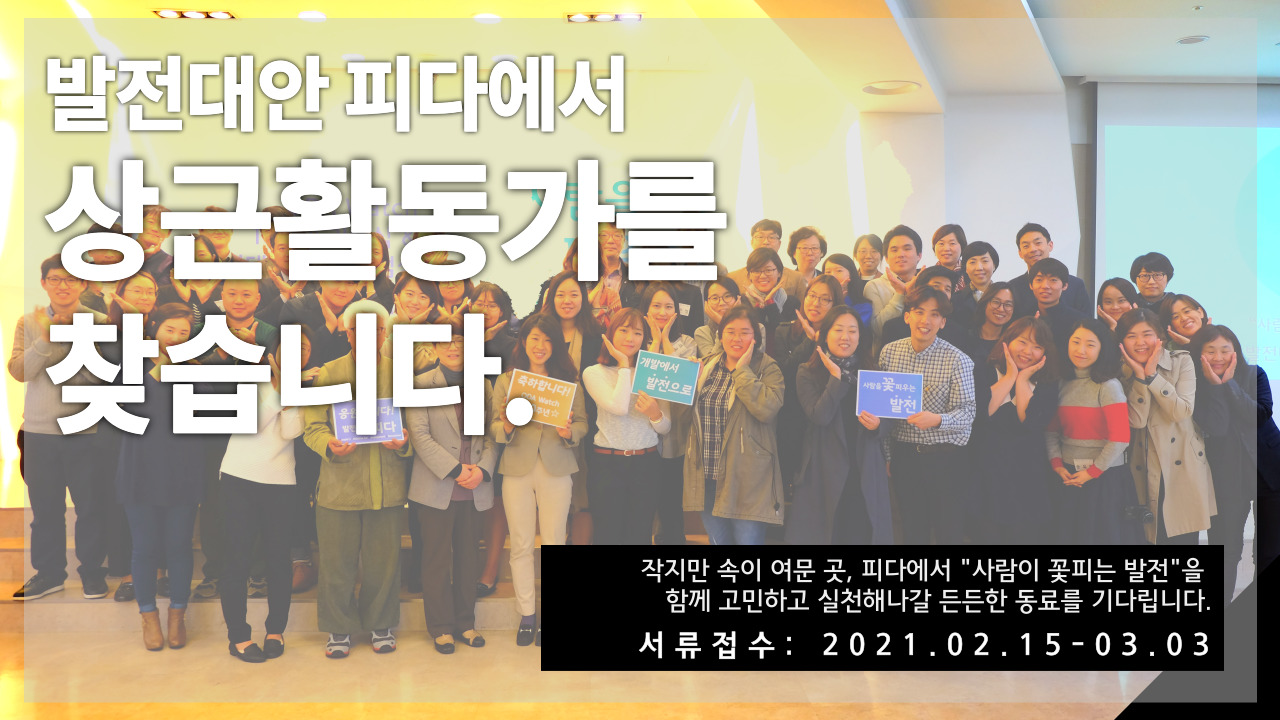작지만 속이 여문 곳, 피다에서 “사람이 꽃피는 발전”을 함께 고민하고, 실천해나갈 든든한 동료를 기다립니다. 많은 관심과 지원 바랍니다.